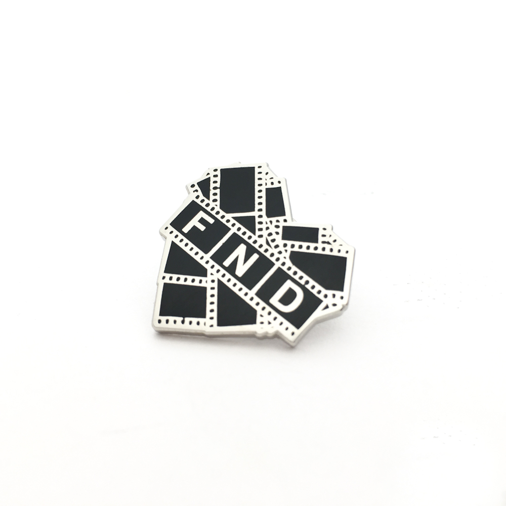 The FND pin badge in a colour way inspired by the Legendary Agfa Scala BW positive film.