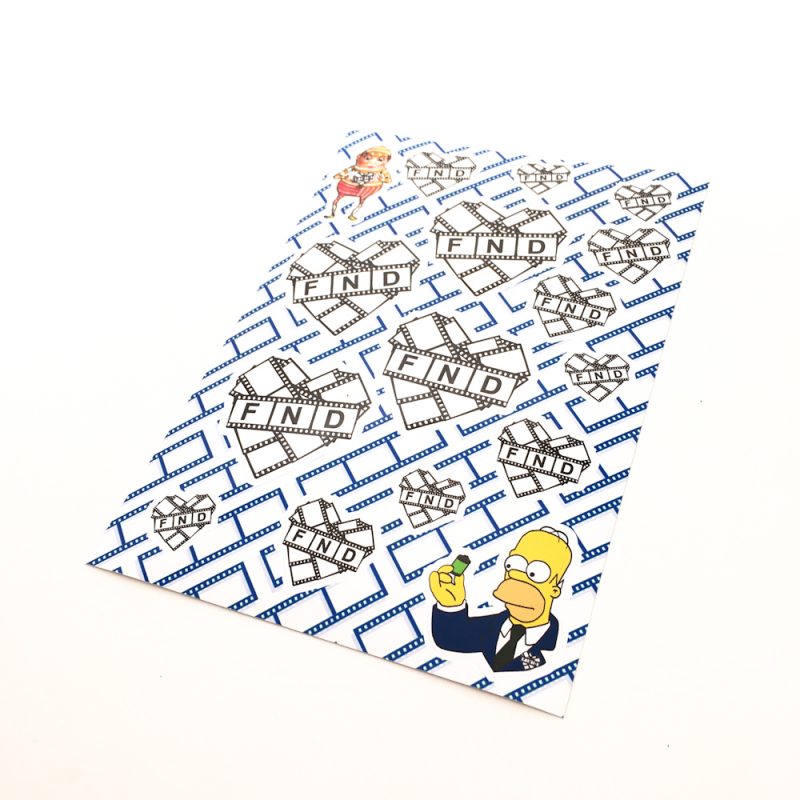 The Film’s not Dead sticker sheets are sold in packs of 3 with 16 stickers on each and are great for anyone. Alongside our logo in multiple sizes they feature Homer Simpson with a roll of 35mm film and the original Kodak Brownie man holding the heart. They come in red with black and white logos, blue with white and black logos and grey with multicolour logos.