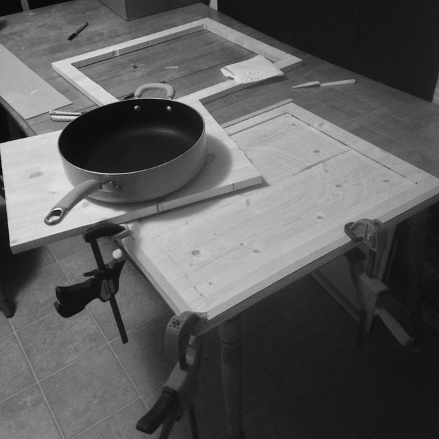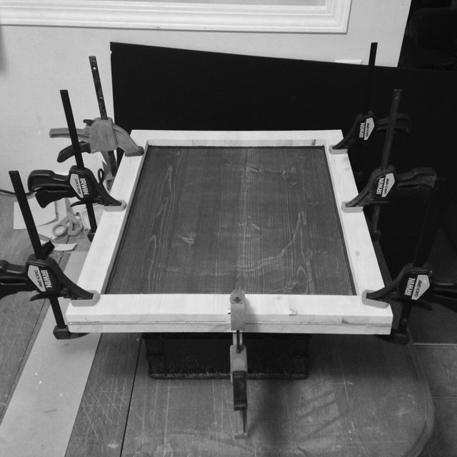 Clamping the top piece of the film back. The colour of the wood is darker now since I chose to do a quick layer of stain to make sure all the hard to reach (stain) places would have some sort of protective coating.