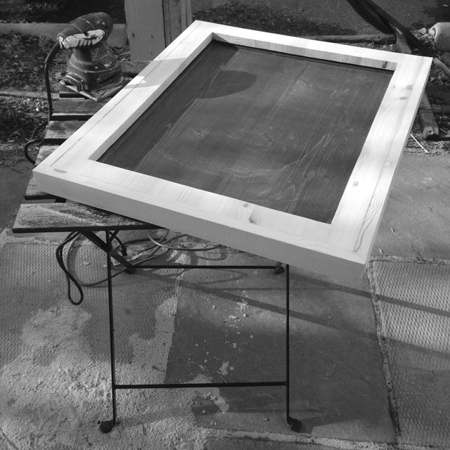 Here you can see where I used a router to make a space large enough to fit a piece of 16″X20″ light sensitive material. Its depth is deep enough to fit everything from paper to film to 3mm tin or glass. What is being clamped down is an 1/8th inch piece of MDF; once the top piece of wood (in the background of the image, top right) is fitted on top of the MDF, there would be enough space for a dark slide to fit in to keep the film safe from light.