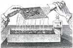 3. The exposed plate is returned to the darkroom where the photographic image on the silvered plate is “brought out” with the fumes from heated mercury. The photographic image is “fixed” by bathing the plate in hyposulphate of soda. The photographic plate with the daguerreotype image is then washed in distilled water and dried.