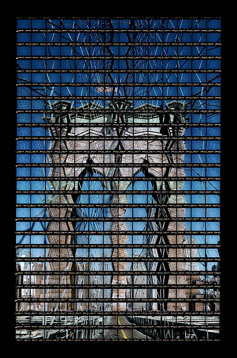 “Each photographic work is made up of horizontally placed film strips of up to 1,269 individual pictures. Every single one of these smaller images was taken with the camera from a slightly shifted perspective and subsequently combined into an overall picture, creating an entirely new image.”