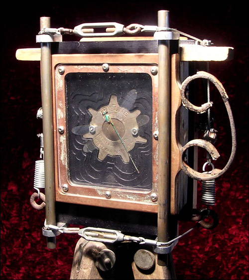 ‘The creation of a camera comes from my desire to relate to a subject. When I choose a subject I spend time studying it. Then I start visualizing how I would like a photo of the subject to look. When that’s figured out, I start on the camera stage of the project by collecting parts, artifacts and relics that relate to the subject.When I’ve gathered enough parts and feel for the subject, I start the construction of the camera. I create the cameras from Aluminum, Titanium, Copper, Brass, Bronze, Steel, Silver, Gold, Wood, Acrylic, Glass, Horn, Ivory, Bone, Human Bone, Human Skulls, Human Organs, Formaldehyde, HIV+ Blood and relics all designed to be the sacred bridge of a communion offering between myself and the subject. All to witness and be a tool of the horrors of creation and the beauty of decay presented by the author light and time.’